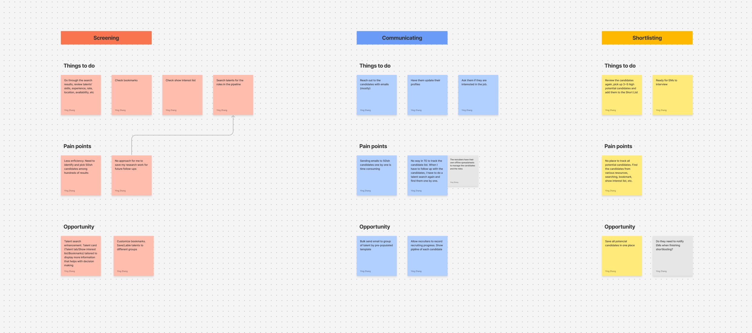 Participants started individually, adding digital sticky notes to a shared board—everything from approving contracts to following up on onboarding delays. Once we had a comprehensive list, we asked them to sort tasks into categories, grouping similar ones together.